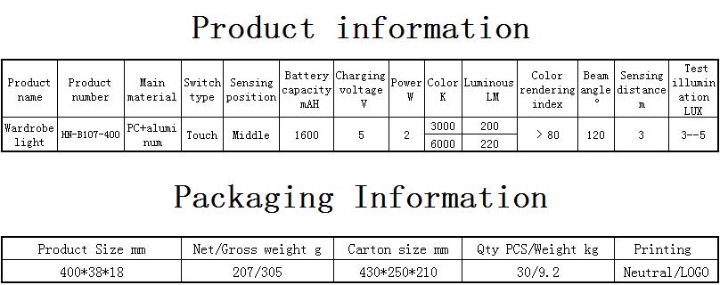 Product description: Built-in high-quality lithium battery, easy to install, multi-purpose sensor lights, widely used for Cabinet、Wardrobe、Wall、Corridor lights, Emergency lighting, product model HN-B107-400